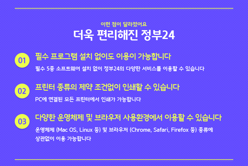 원레 민원24에서 정부24로 사이트가 점진적으로 개편이 되었는데 개편하면서 다양한 OS와 브라우저를 지원하게 된 것 같습니다. 이번에 공지가 나온 것은 아니고, 2019년 7월 29일에 올라온 공지 내용입니다. 지금까지 이러한 사실을 몰랐습니다.